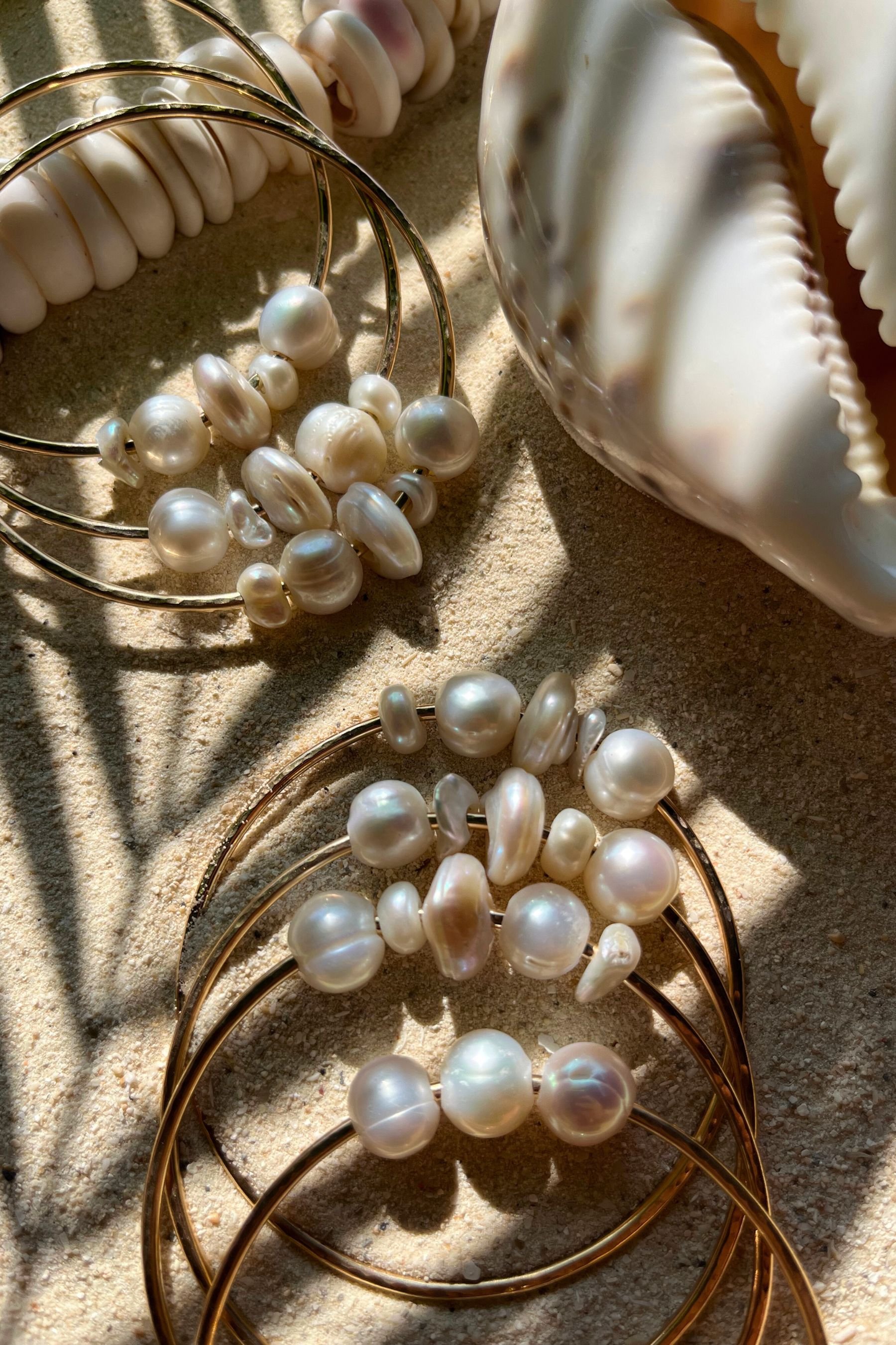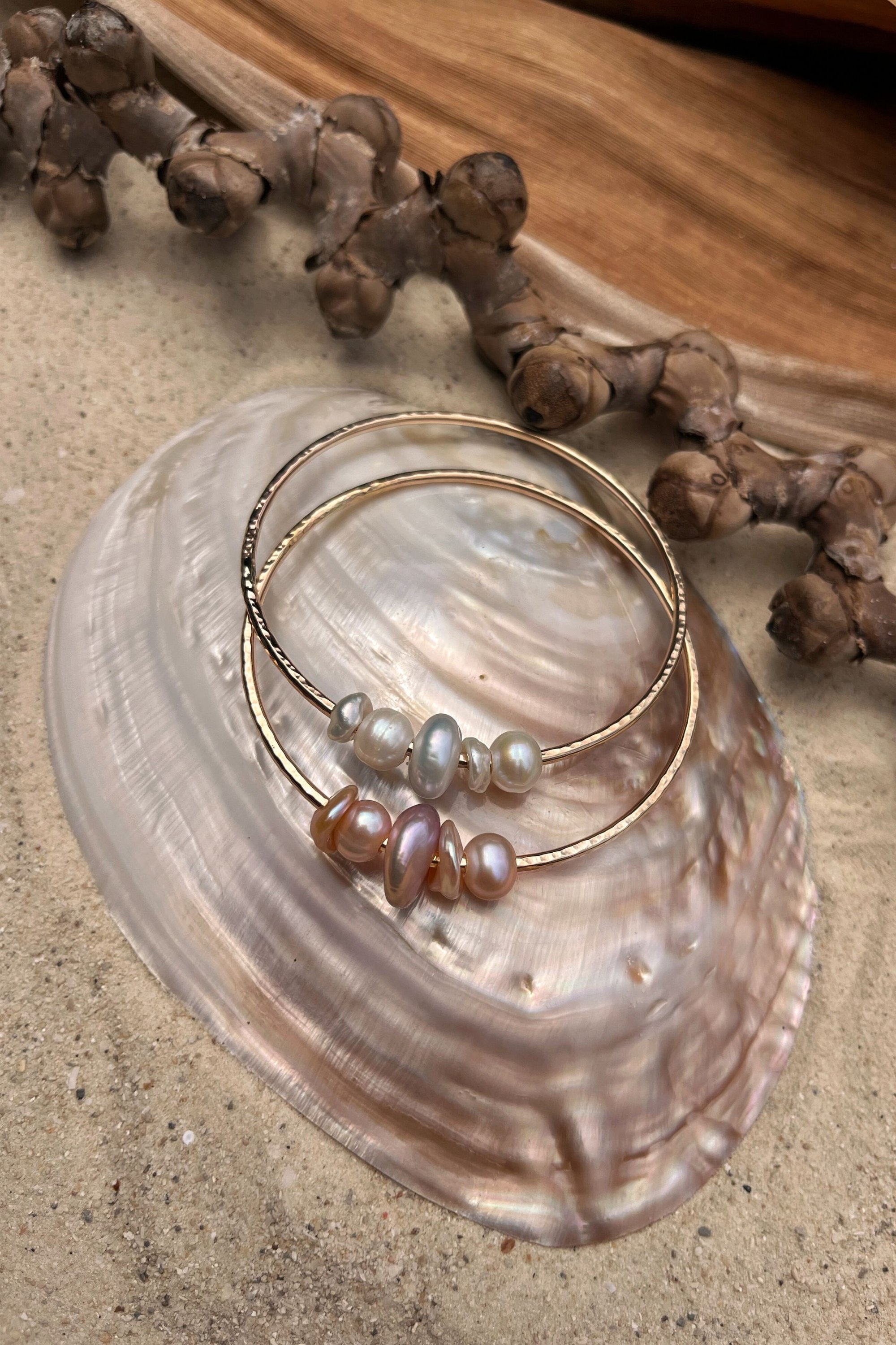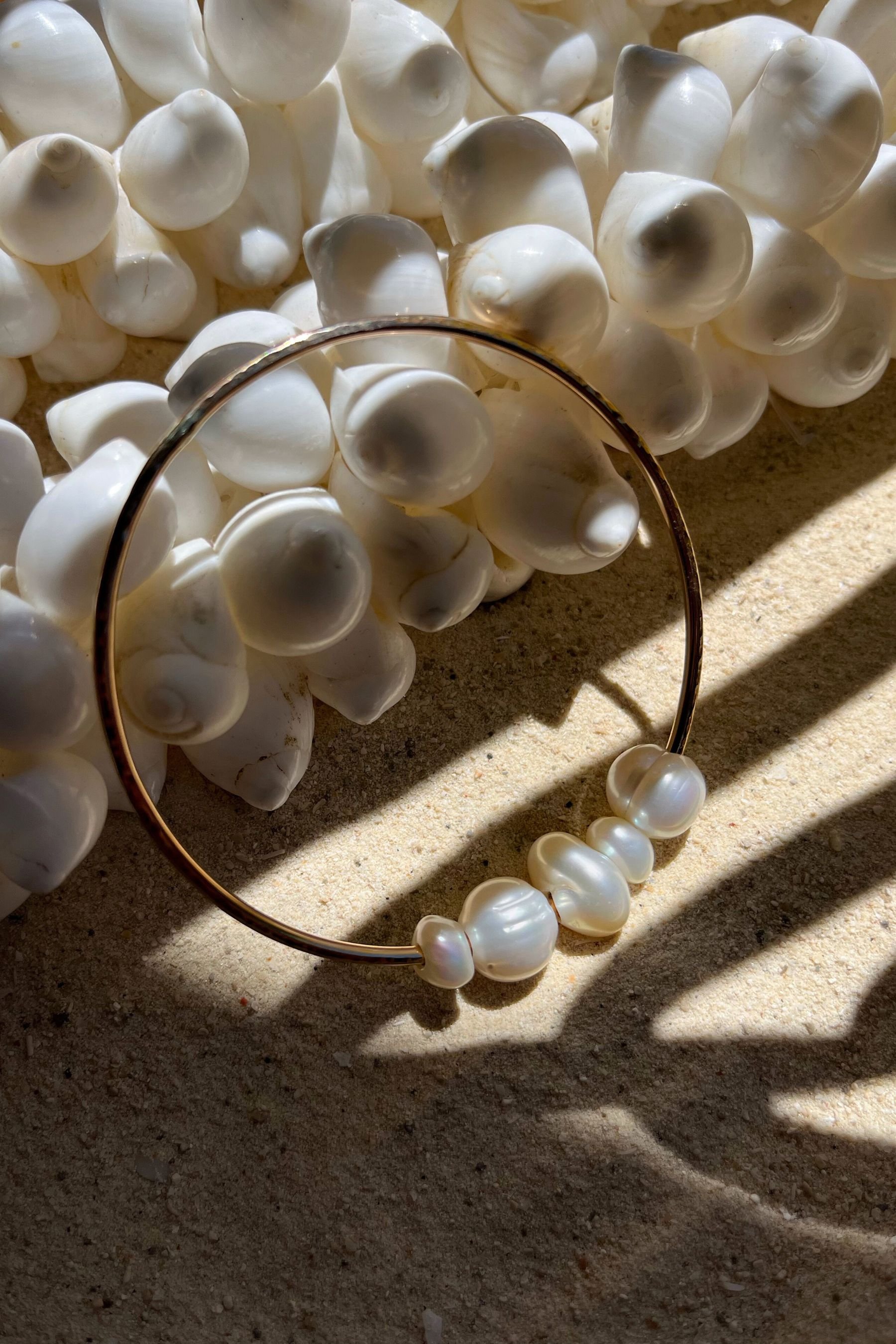 Jonc en goldfilled 14K ou argent massif avec un mélange de 5 perles d'eau douce naturelles. Les bracelets ont une finition martelée qui capte joliment la lumière.