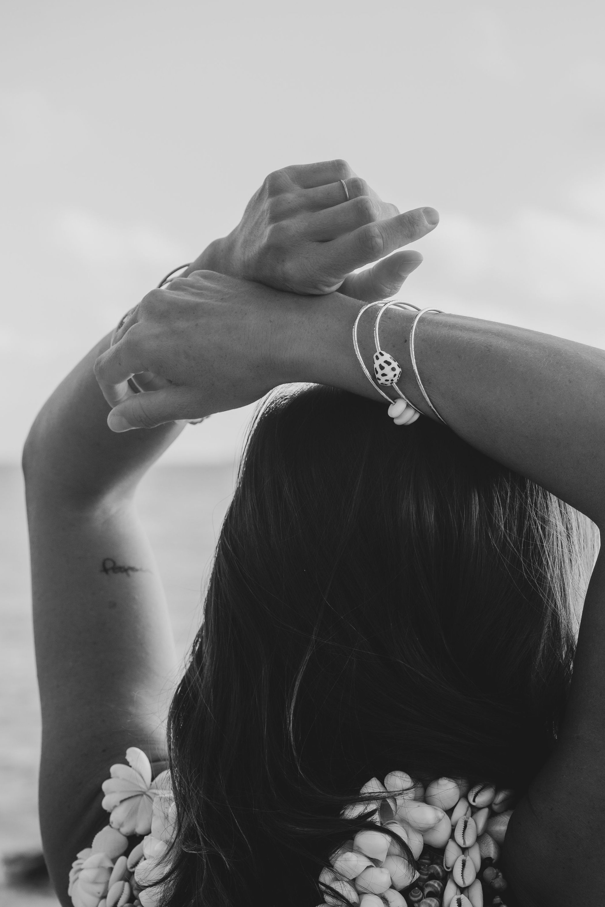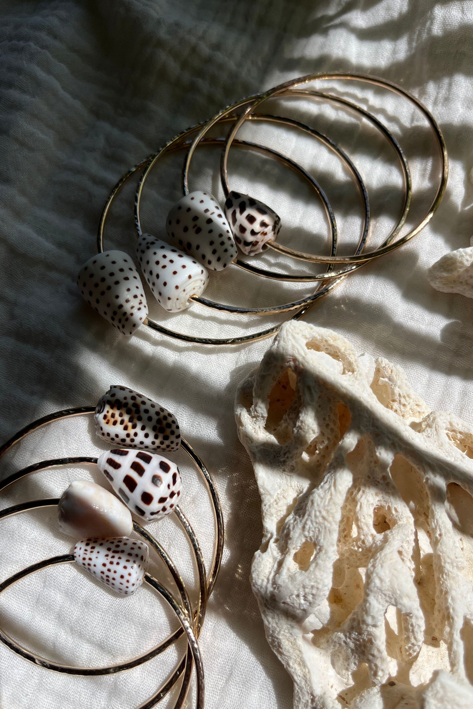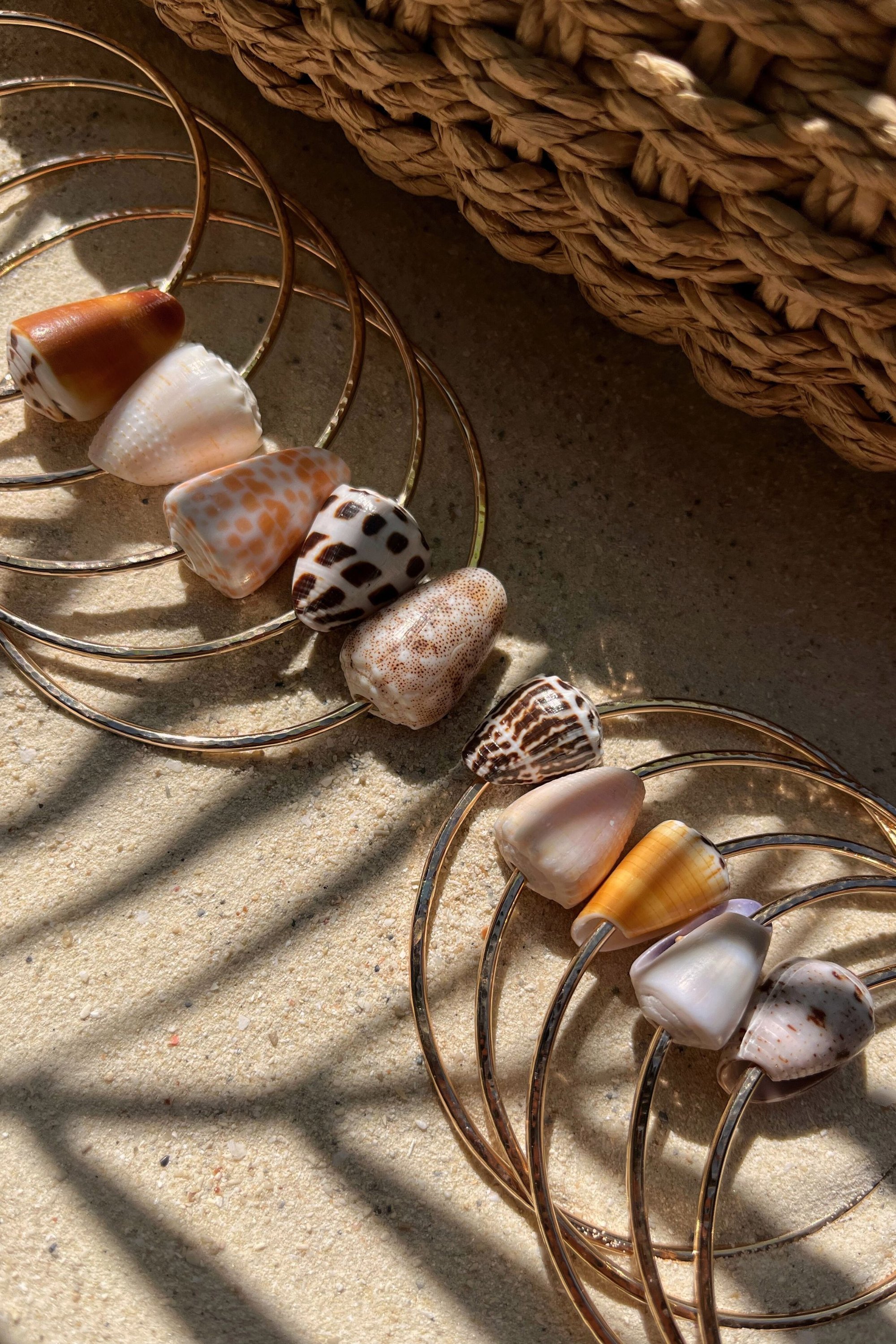 Jonc en goldfilled 14K ou en argent massif avec un coquillage tropical, le bracelet a une finition martelée qui capte joliment la lumière.