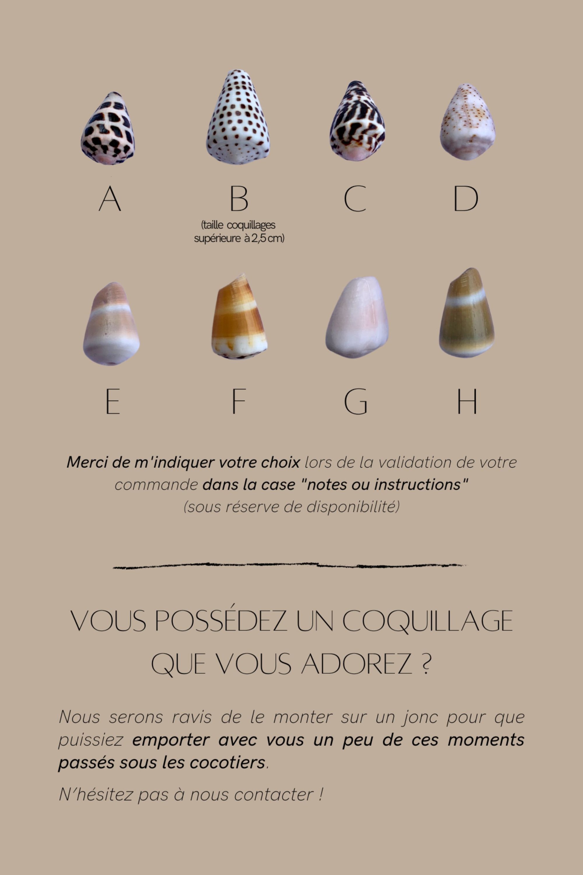 + Les coquillages sont des créations de la nature uniques, il peut y avoir des variations par rapport aux photos présentées ici.