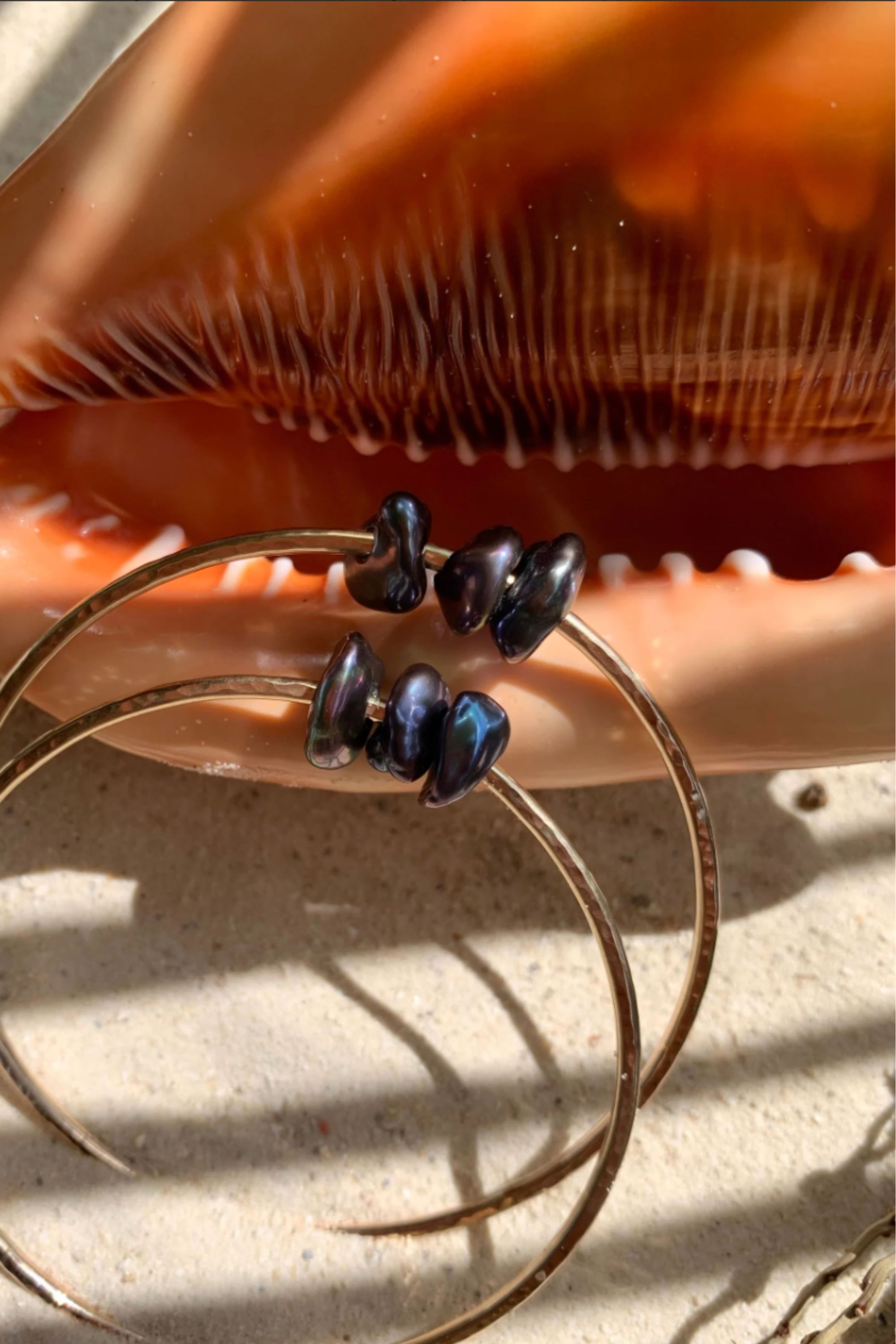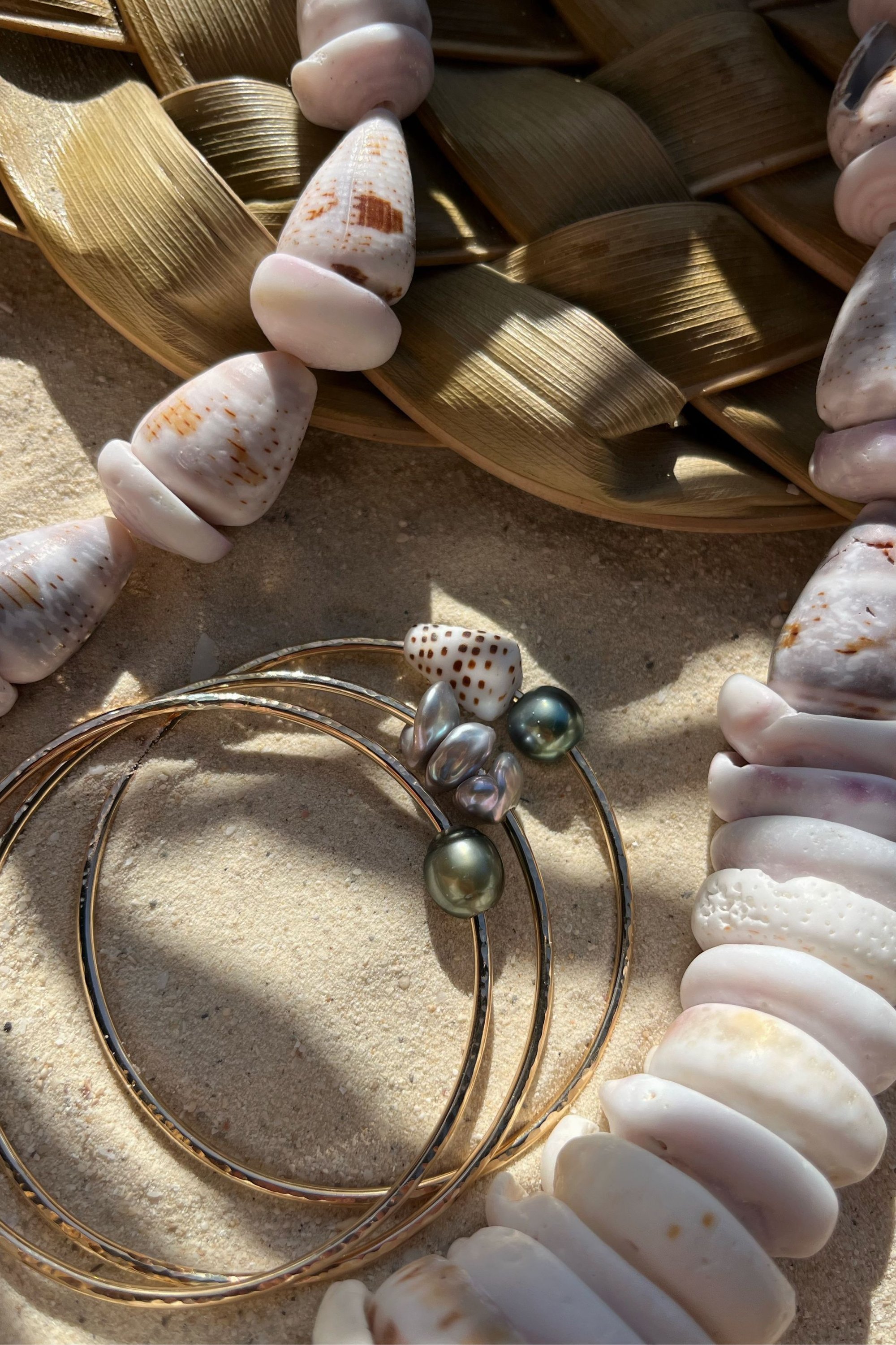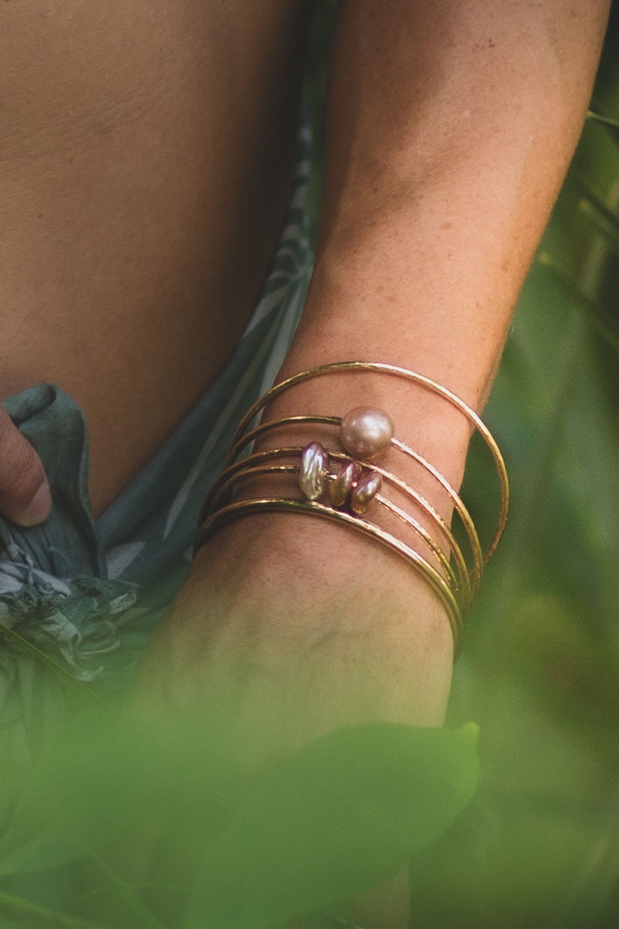 Jonc en goldfilled 14K ou argent massif avec 3 keshis. Les bracelets ont une finition martelée qui capte joliment la lumière.