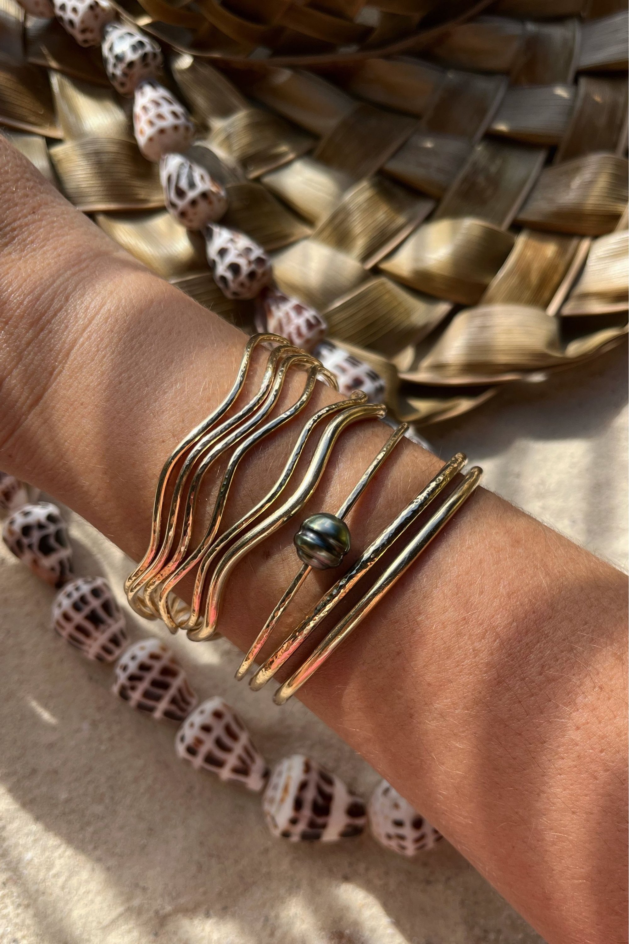 Joncs en goldfilled 14K ou argent massif, les bracelets ont une finition martelée et ondulée qui capte joliment la lumière.