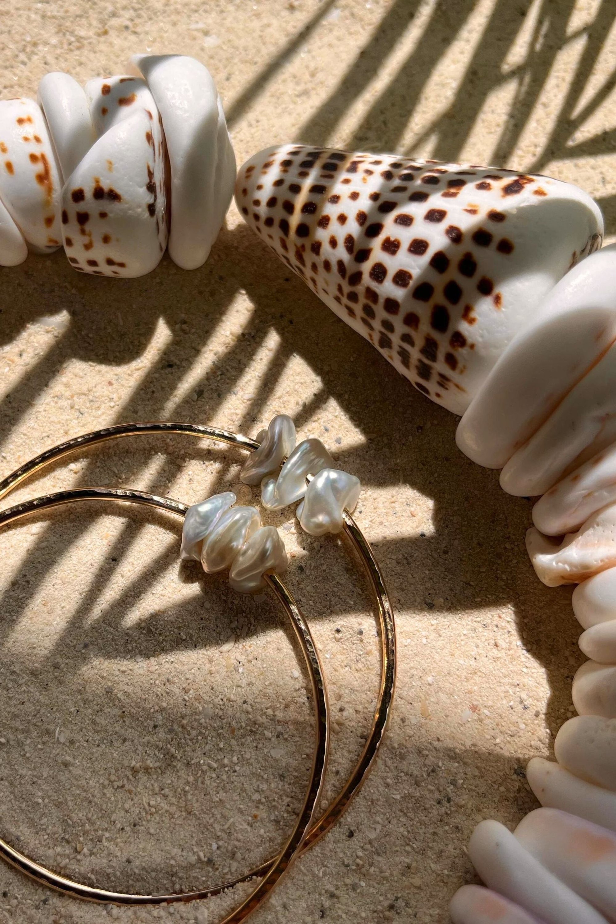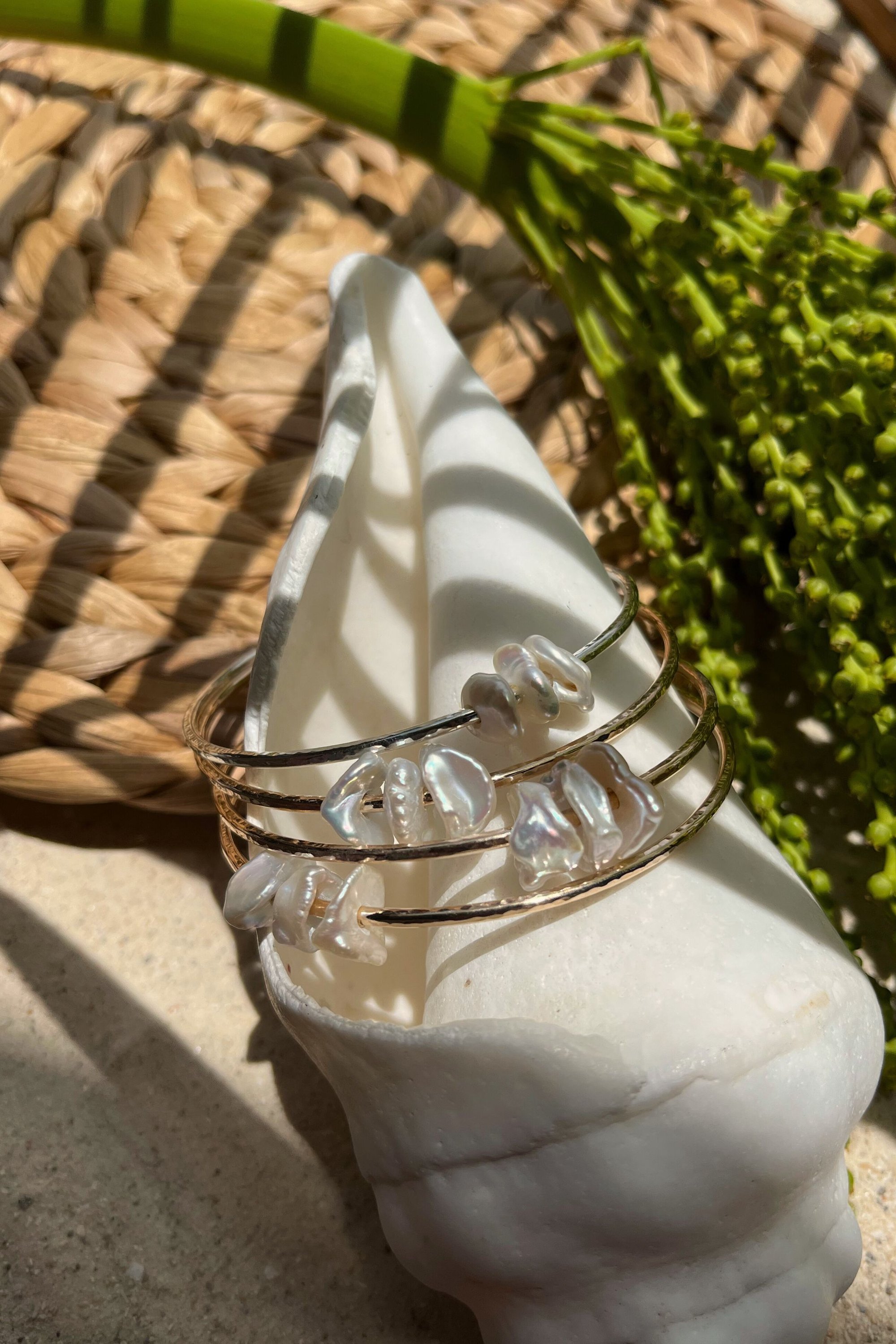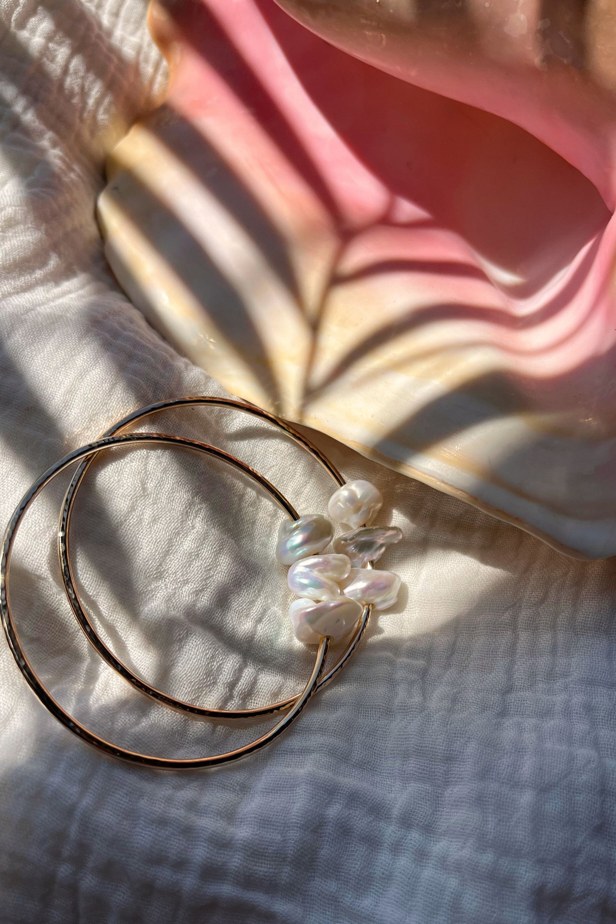 Jonc en goldfilled 14K ou argent massif avec 3 keshis blancs. Les bracelets ont une finition martelée qui capte joliment la lumière.