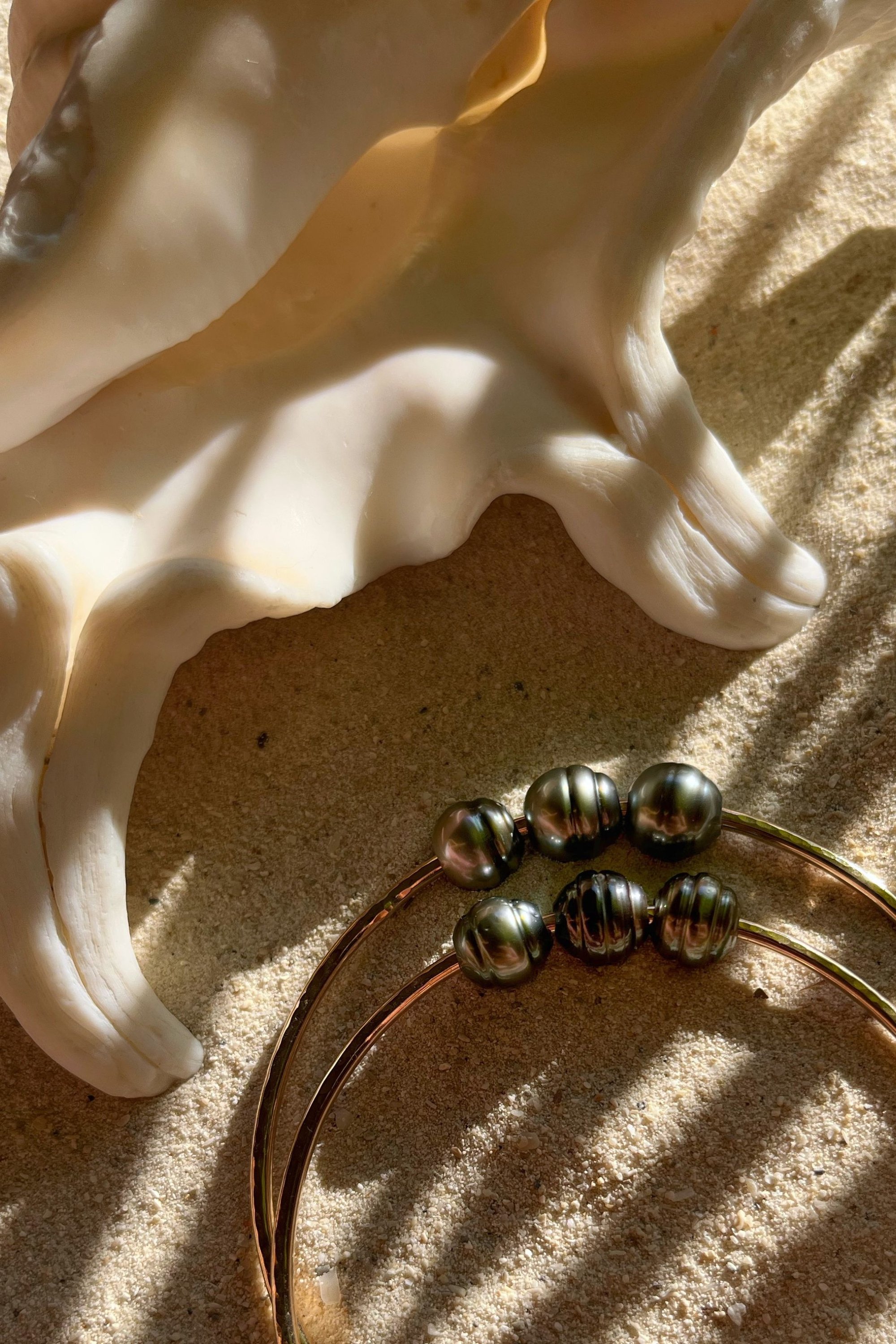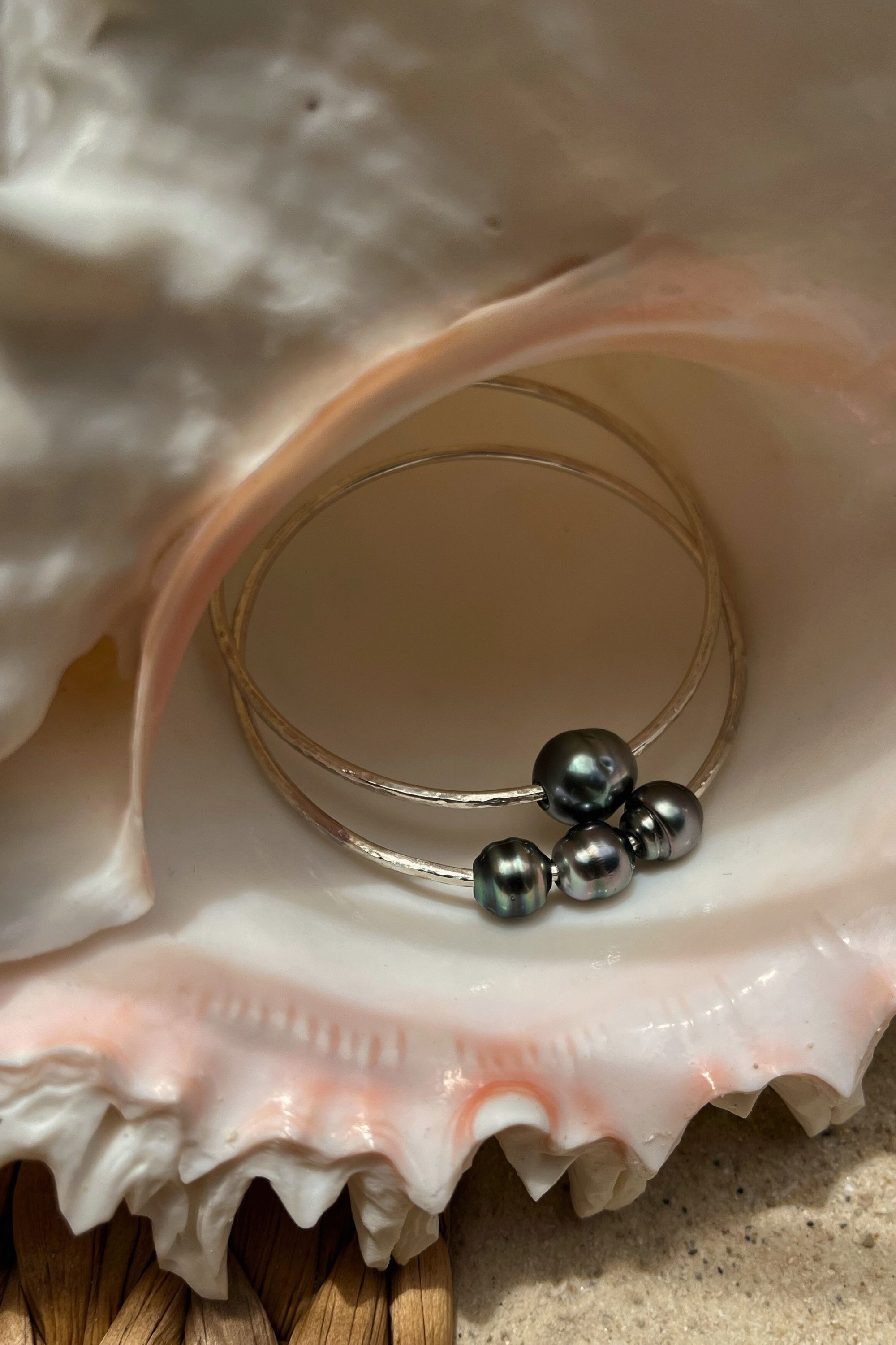 Jonc en goldfilled 14K ou argent massif avec trois perles de Tahiti. Le bracelet a une finition martelée qui capte joliment la lumière.