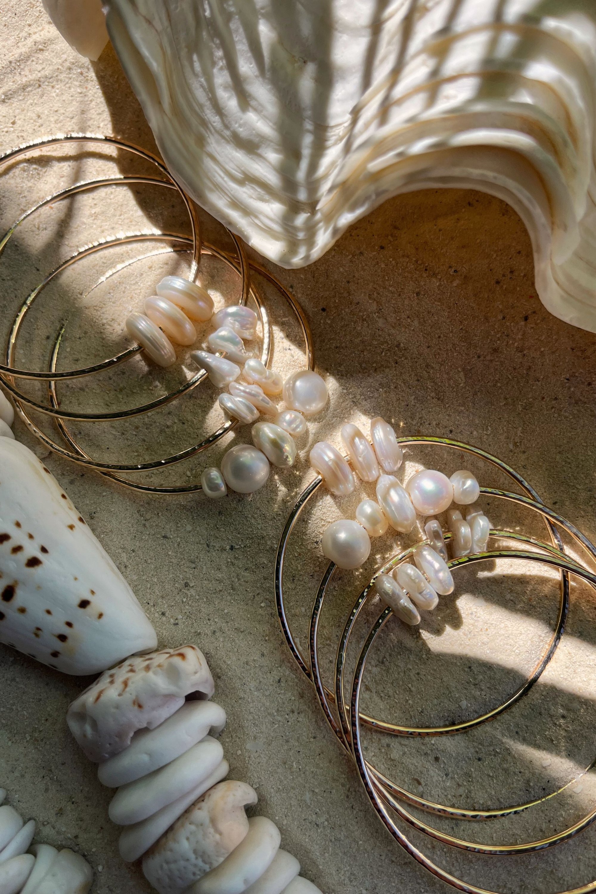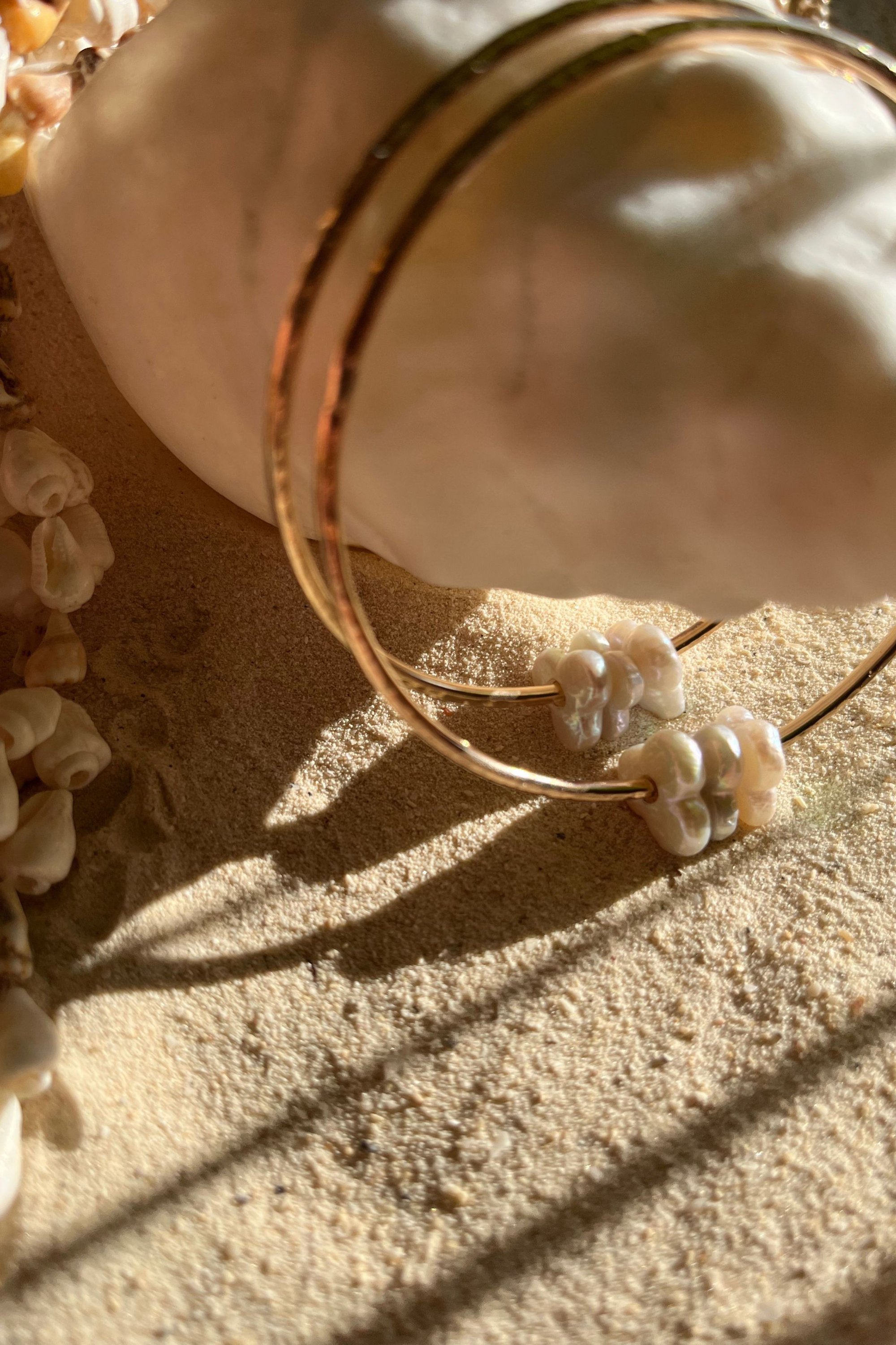 Jonc en goldfilled 14K ou argent massif avec 3 perles d'eau douces naturelles. Les bracelets ont une finition martelée qui capte joliment la lumière.