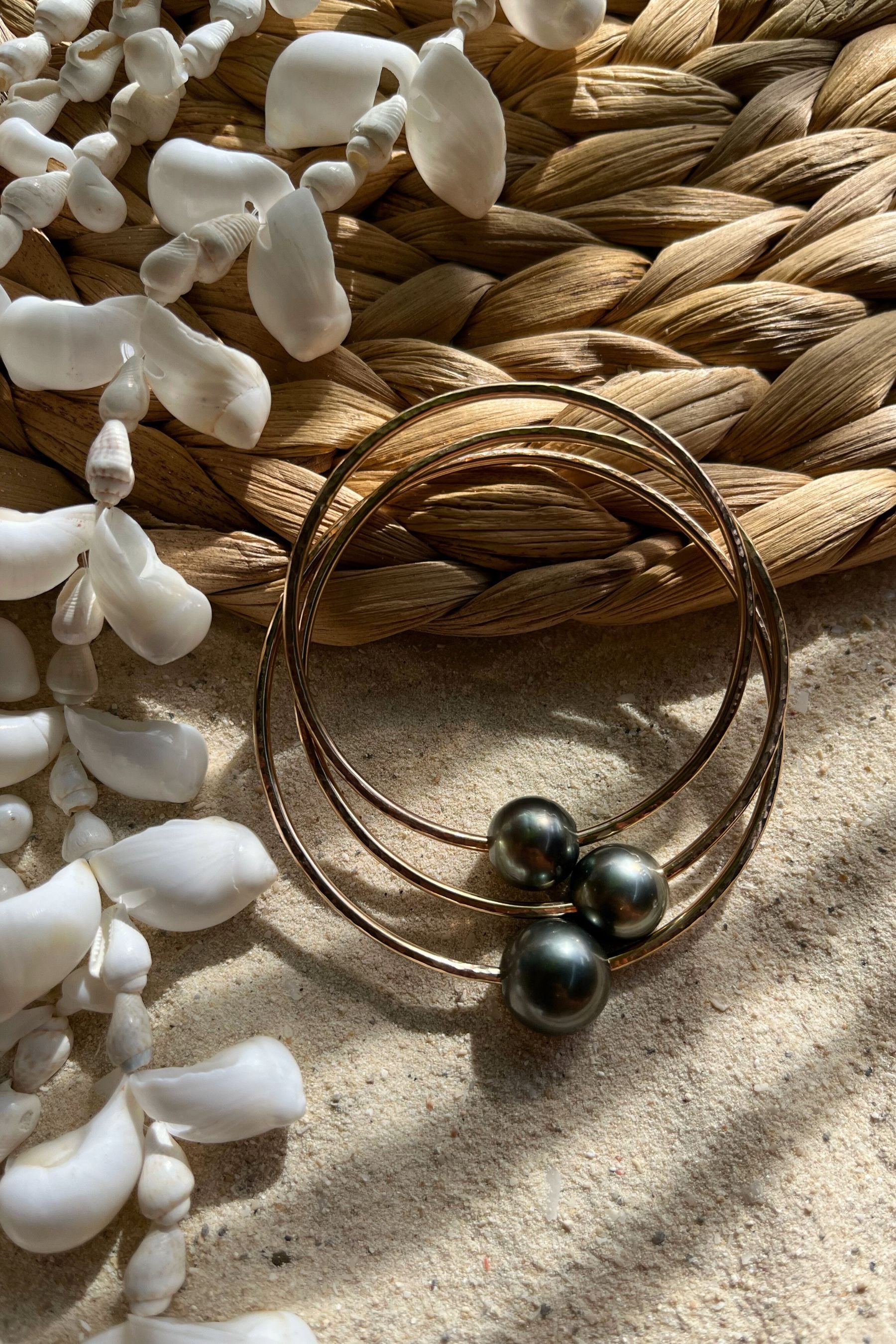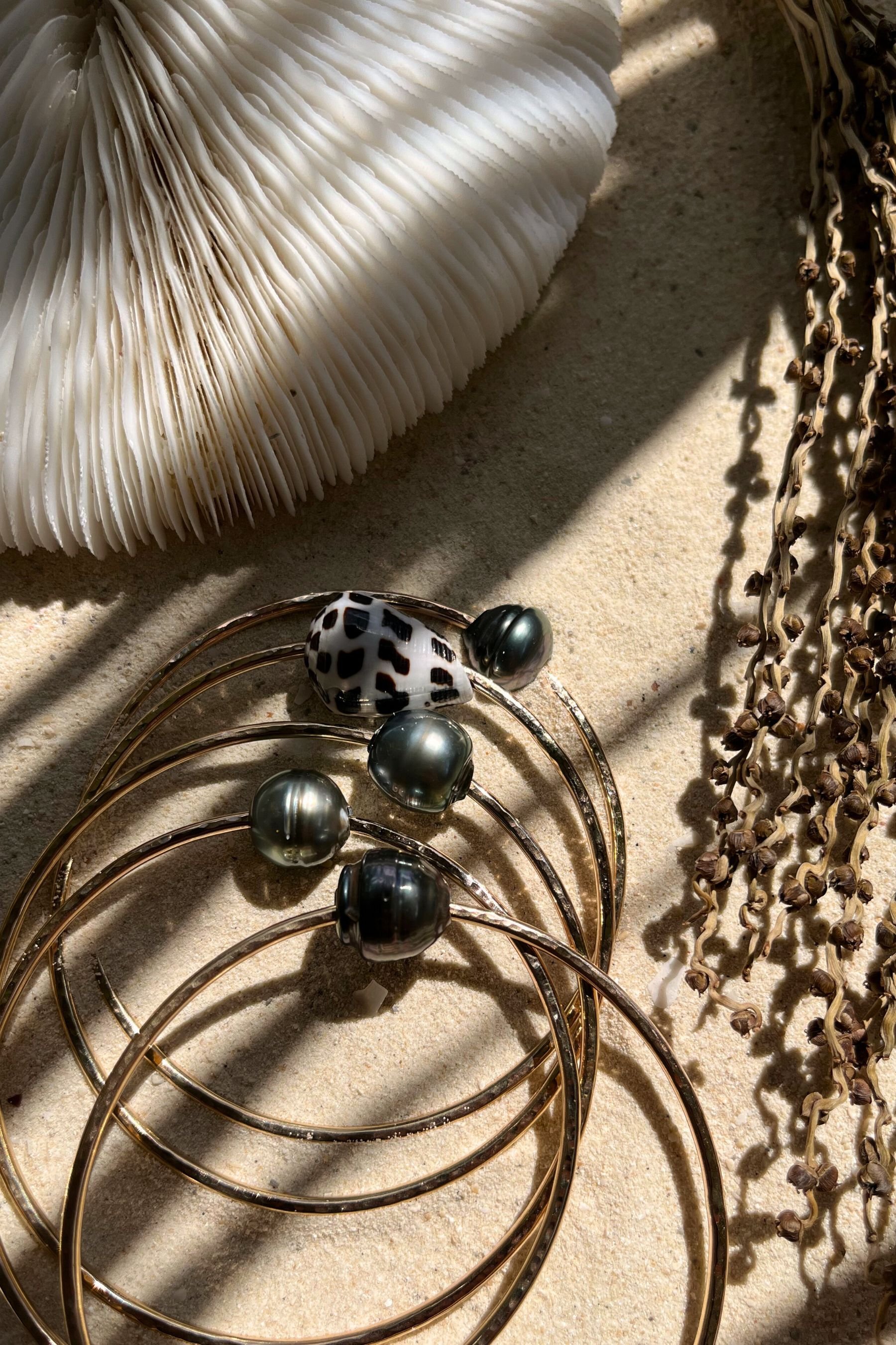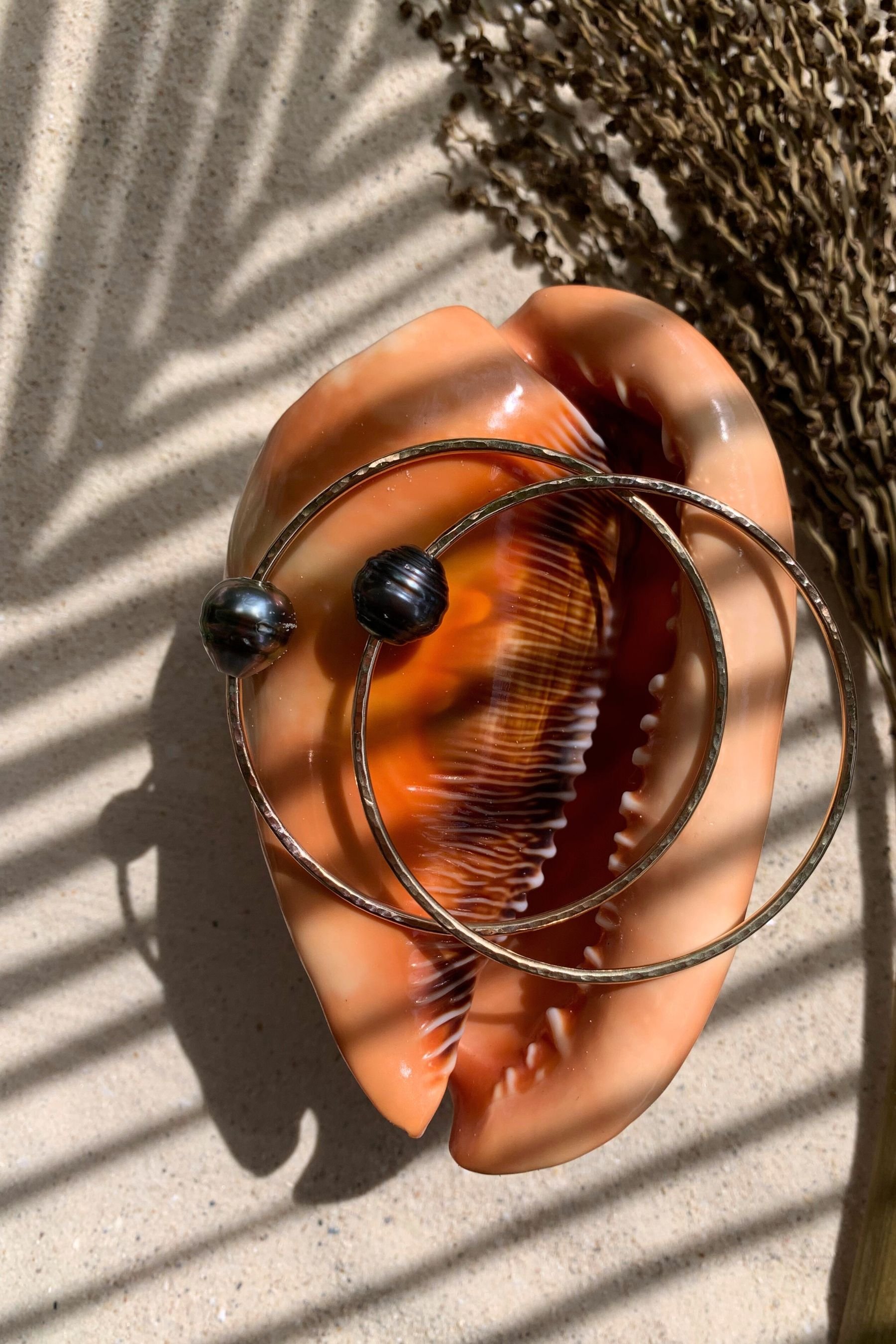 Jonc en goldfilled 14K ou argent massif avec une perle de Tahiti. Le bracelet a une finition martelée qui capte joliment la lumière.