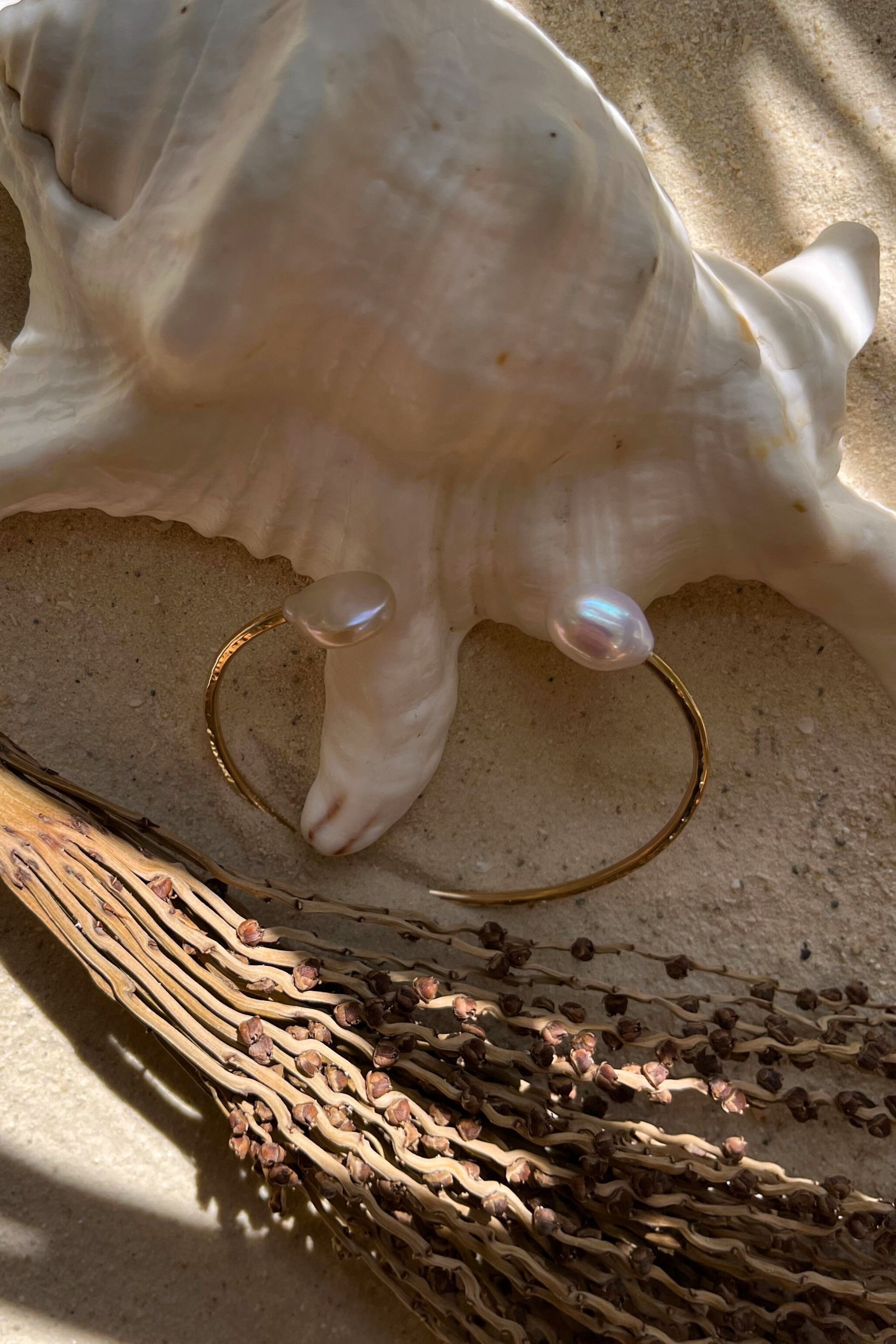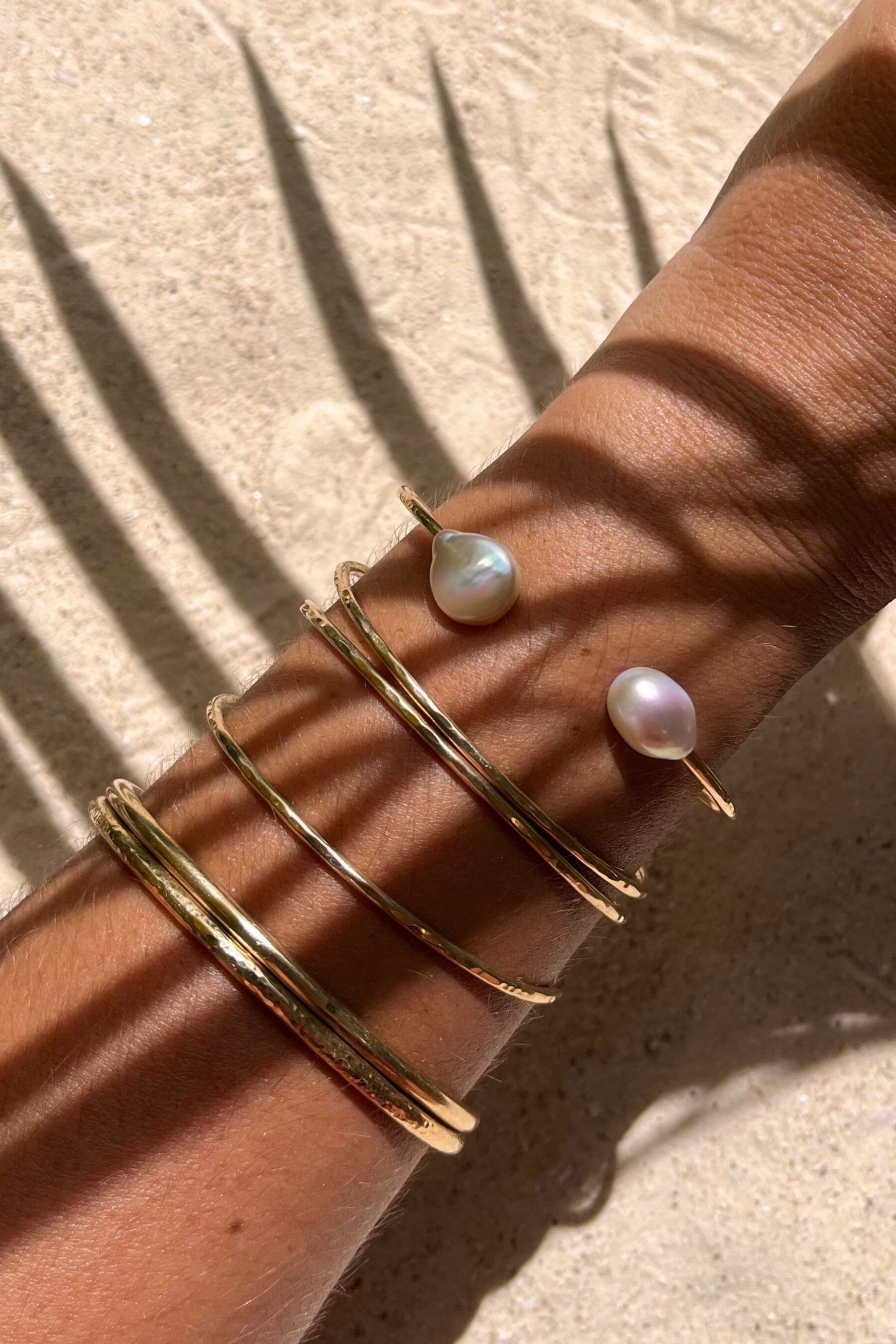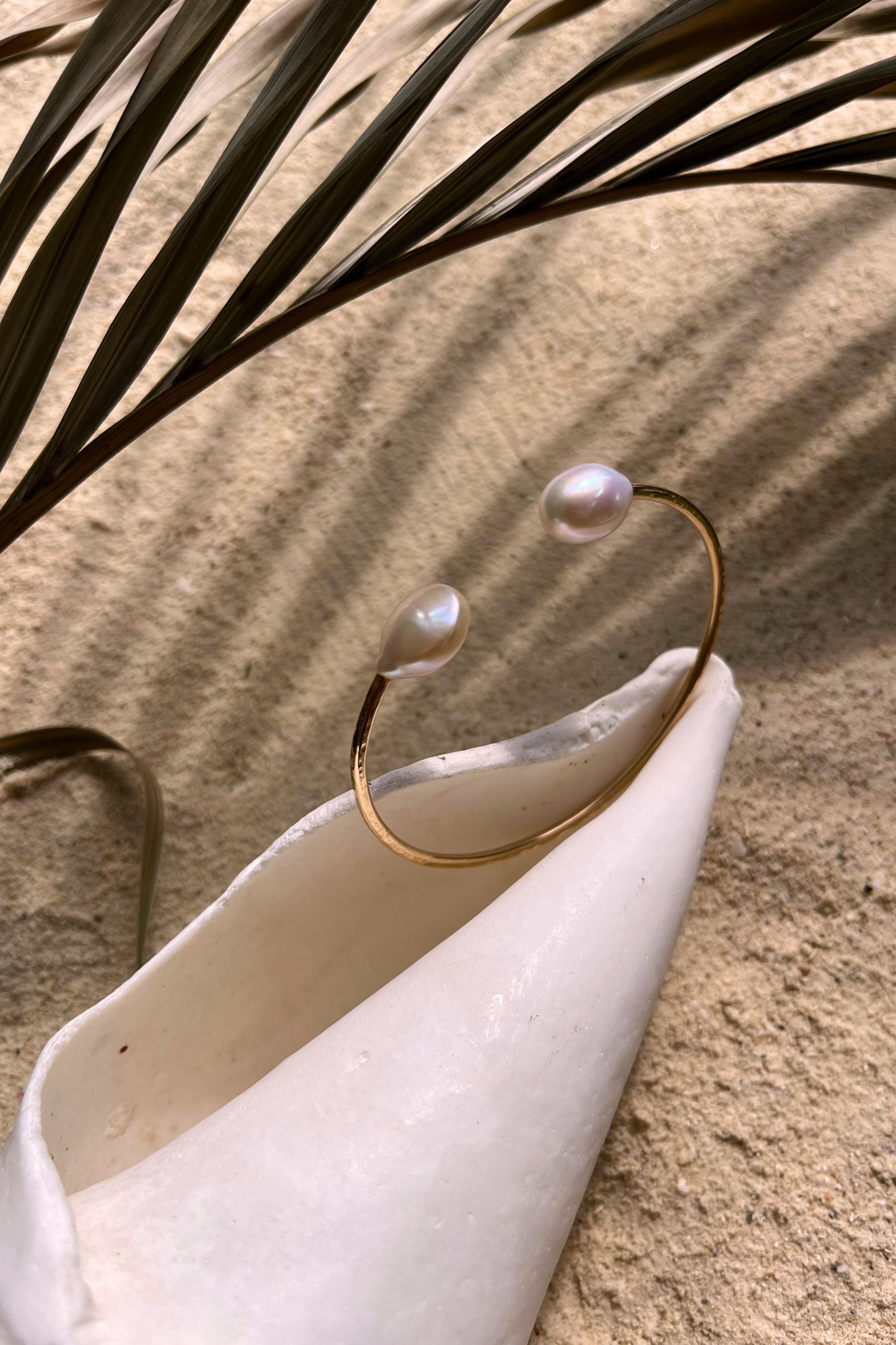 Bracelet Toi & Moi en Goldfilled 14K avec deux sublimes perles d'eau douce blanches, l'une pleine et ovale, l'autre plate et ronde. Le bracelet a une finition martelée qui capte joliment la lumière.