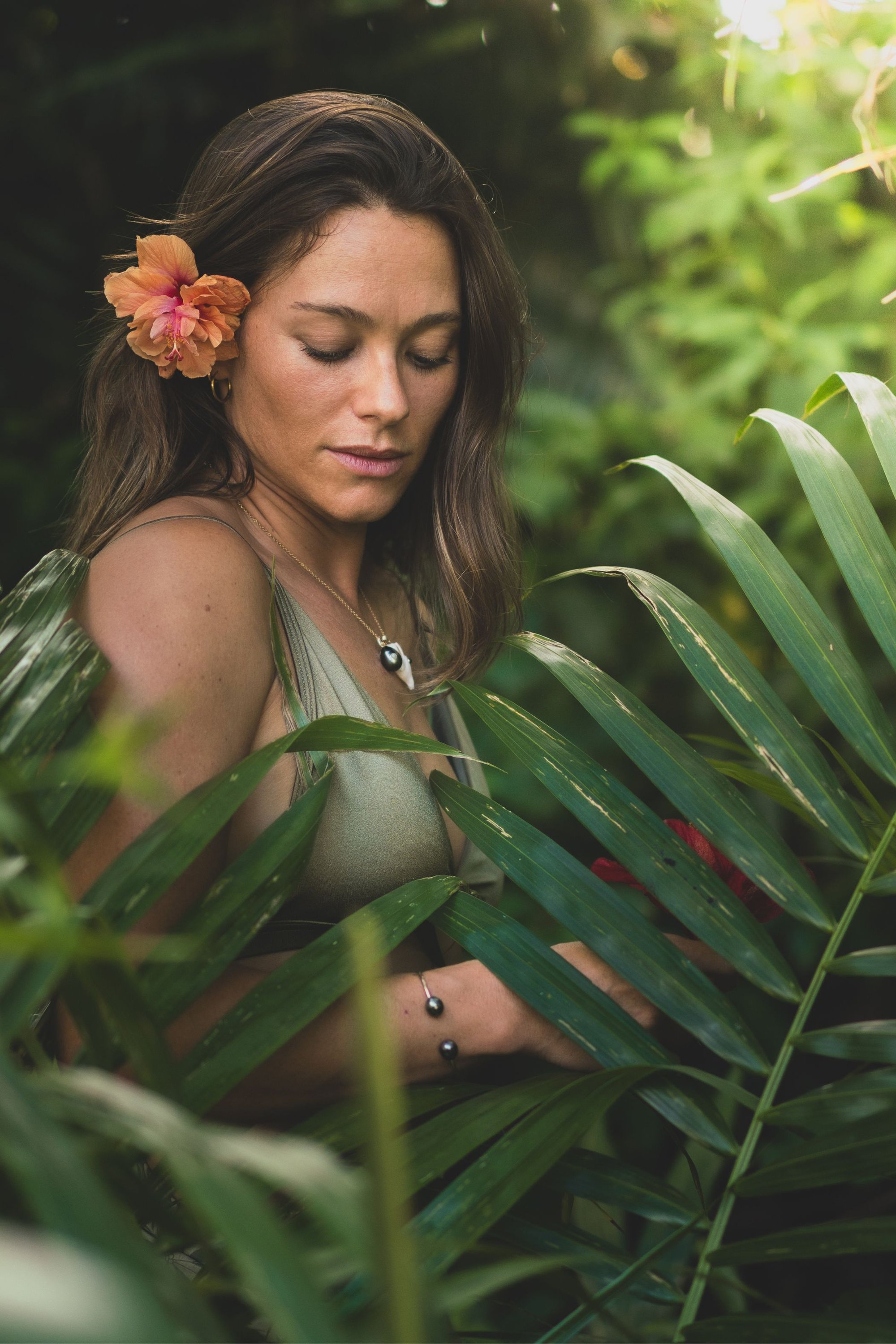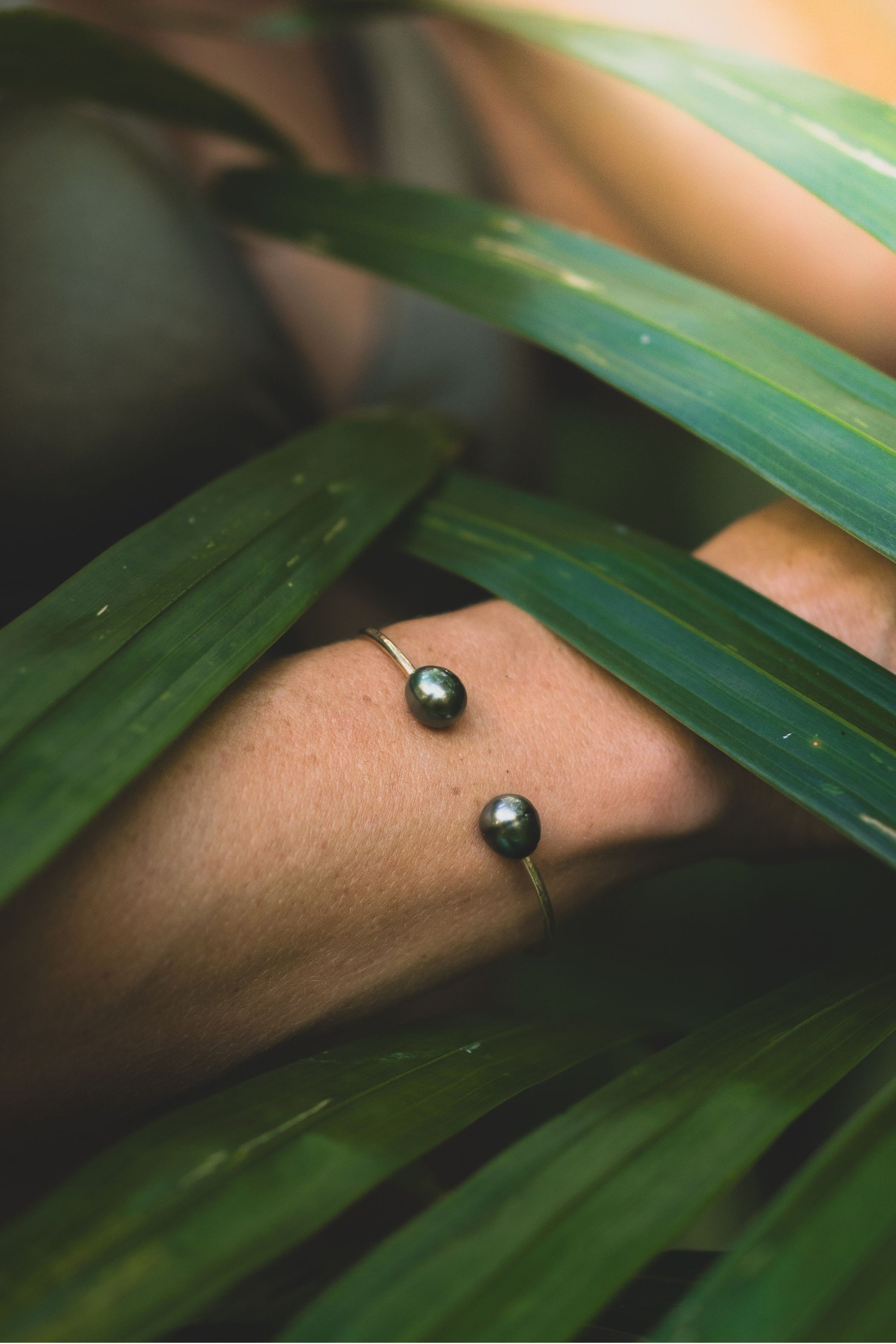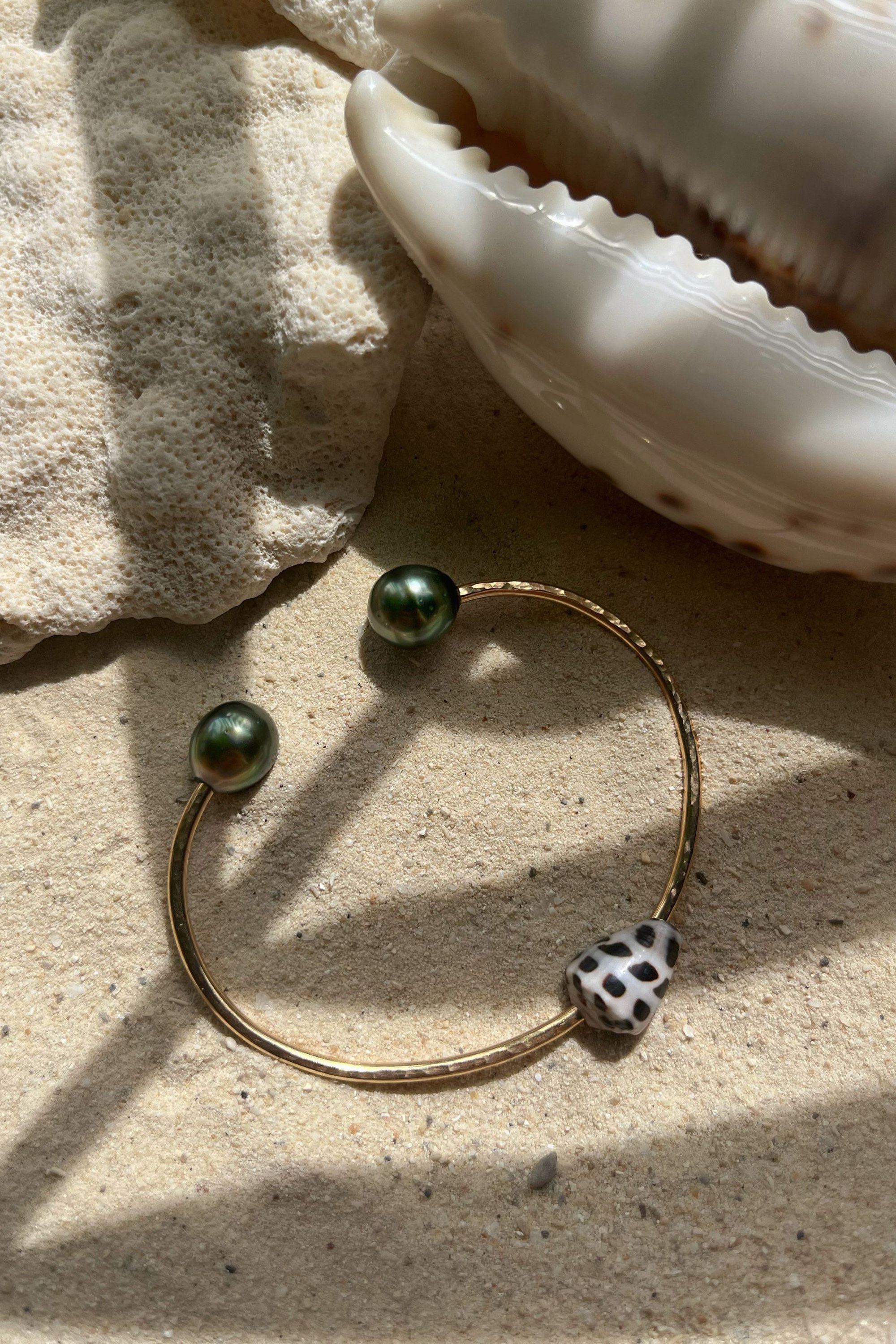 Toi & Moi en goldfilled 14K ou argent massif avec deux perles de Tahiti et un coquillage tropical, le bracelet a une finition martelée qui capte joliment la lumière.