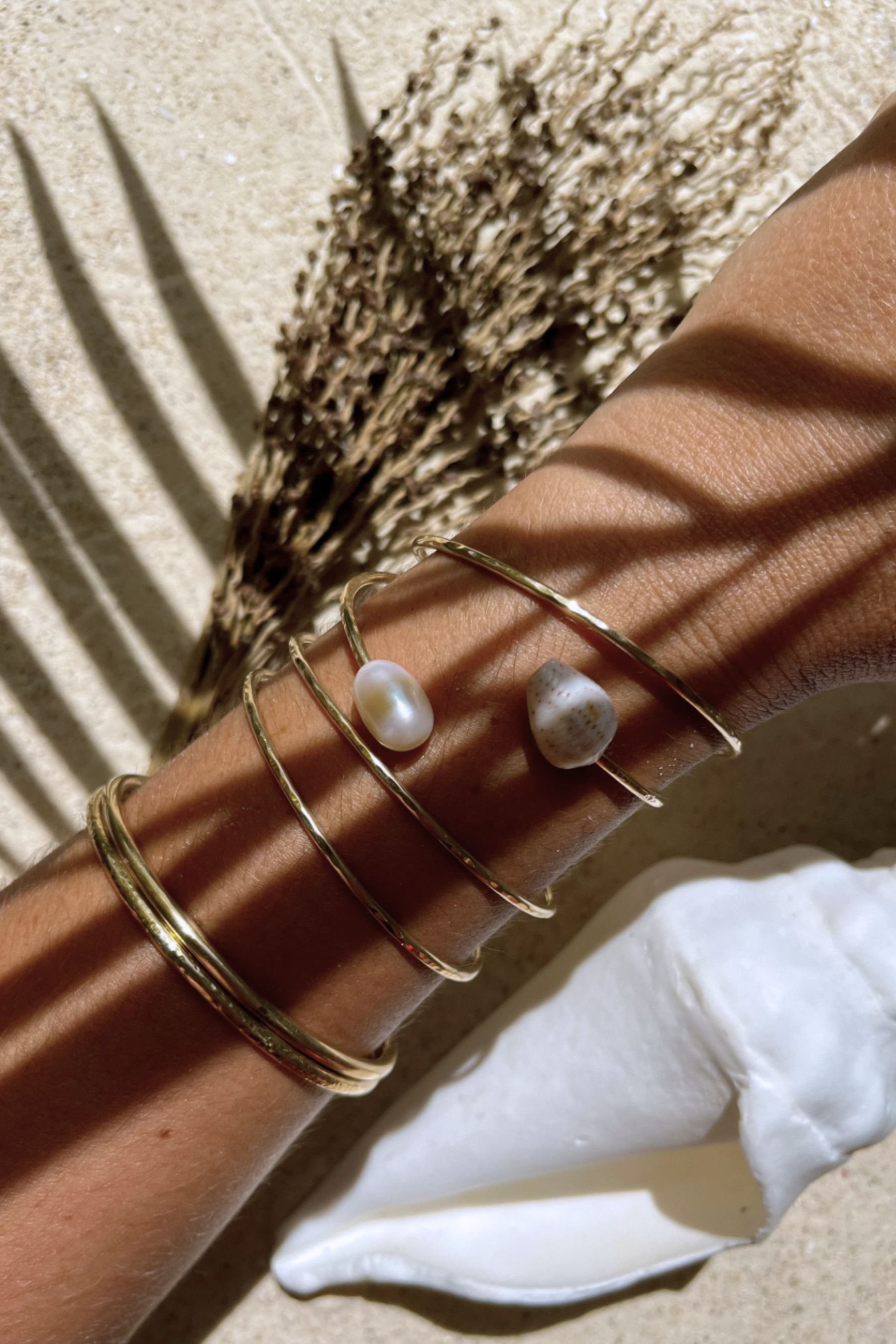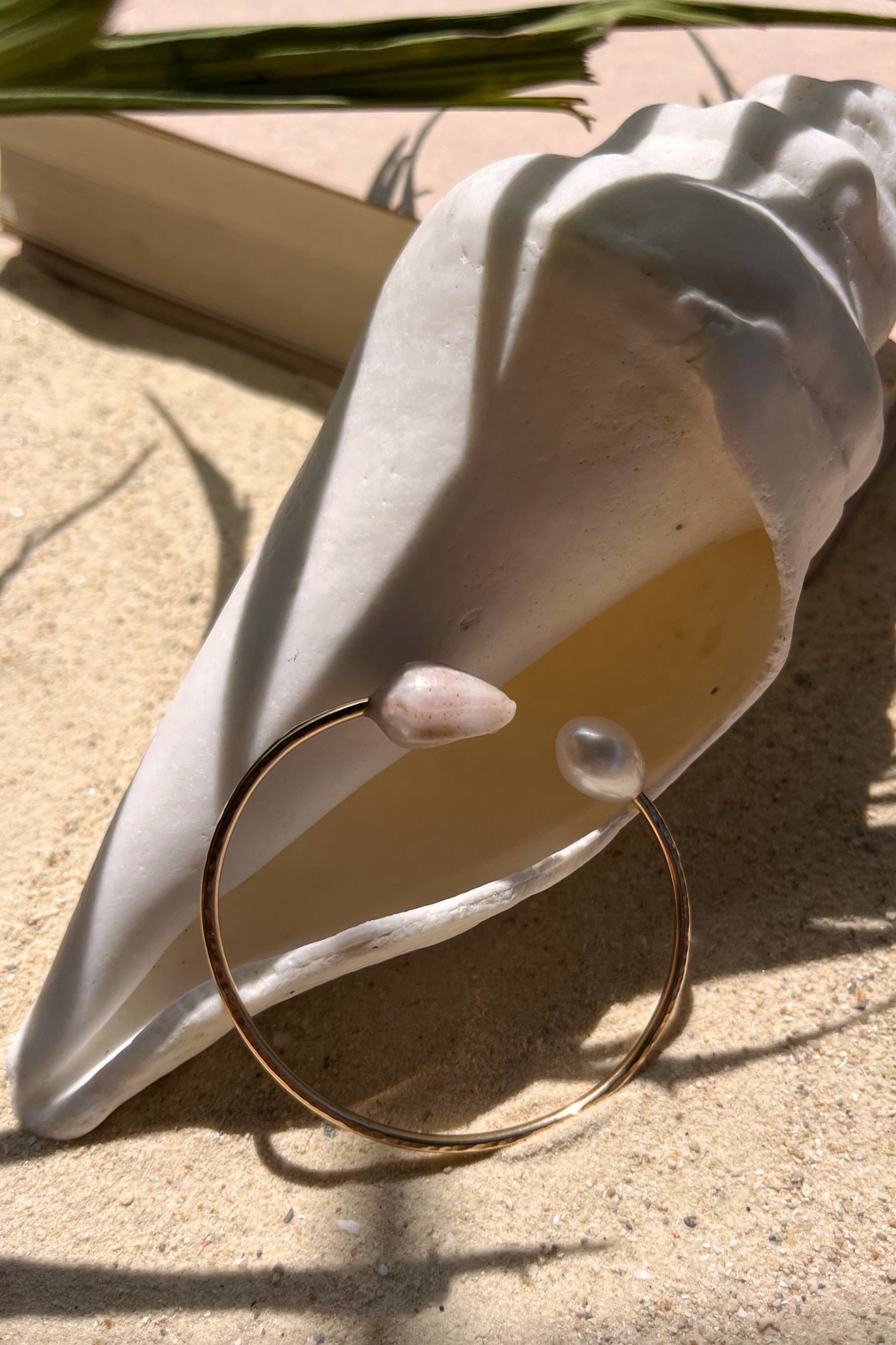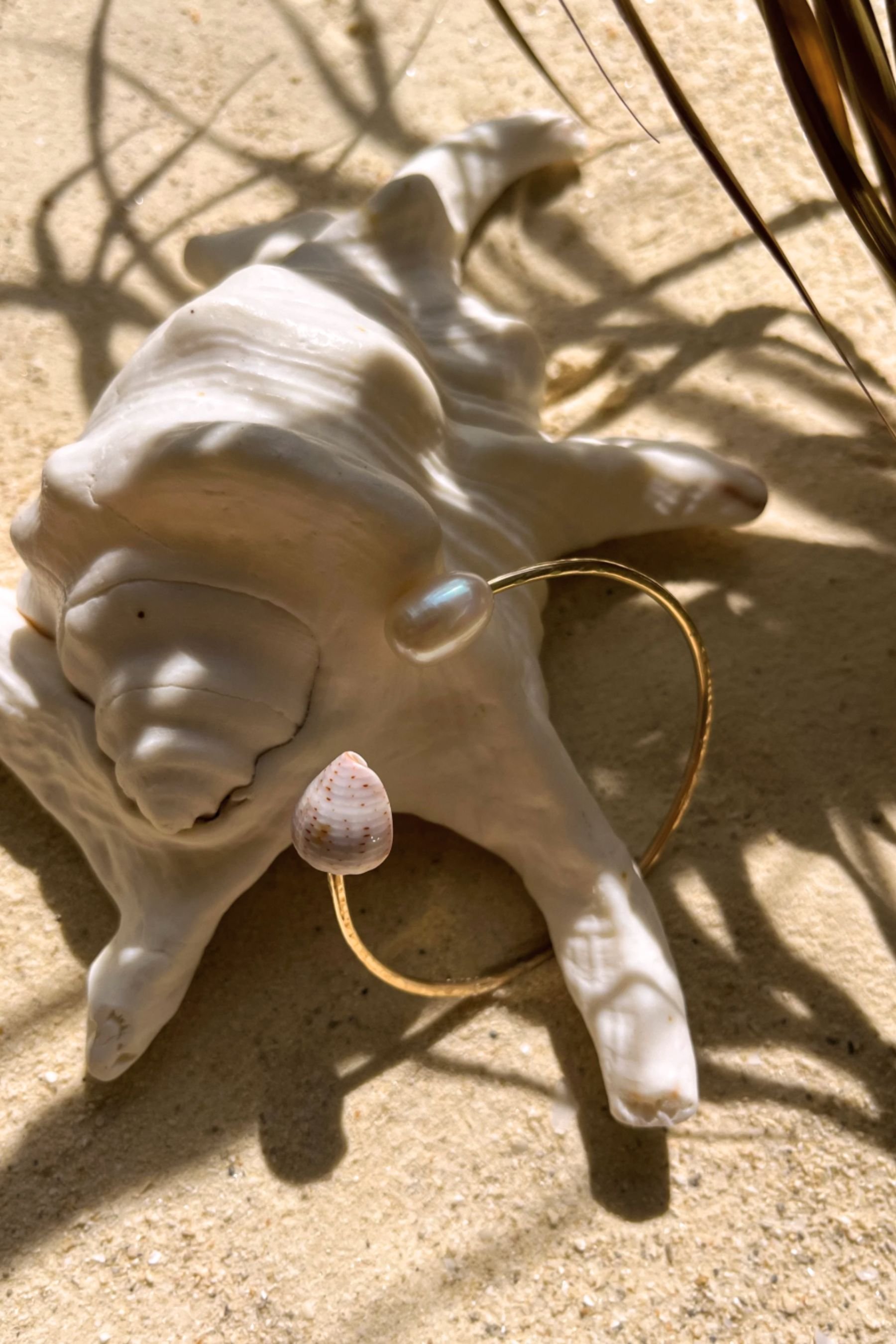 Bracelet Toi & Moi en Goldfilled 14K avec une superbe perle d'eau douce blanche et un délicat coquillage, un cône, dans les tons roses clair. Le bracelet a une finition martelée qui capte joliment la lumière.