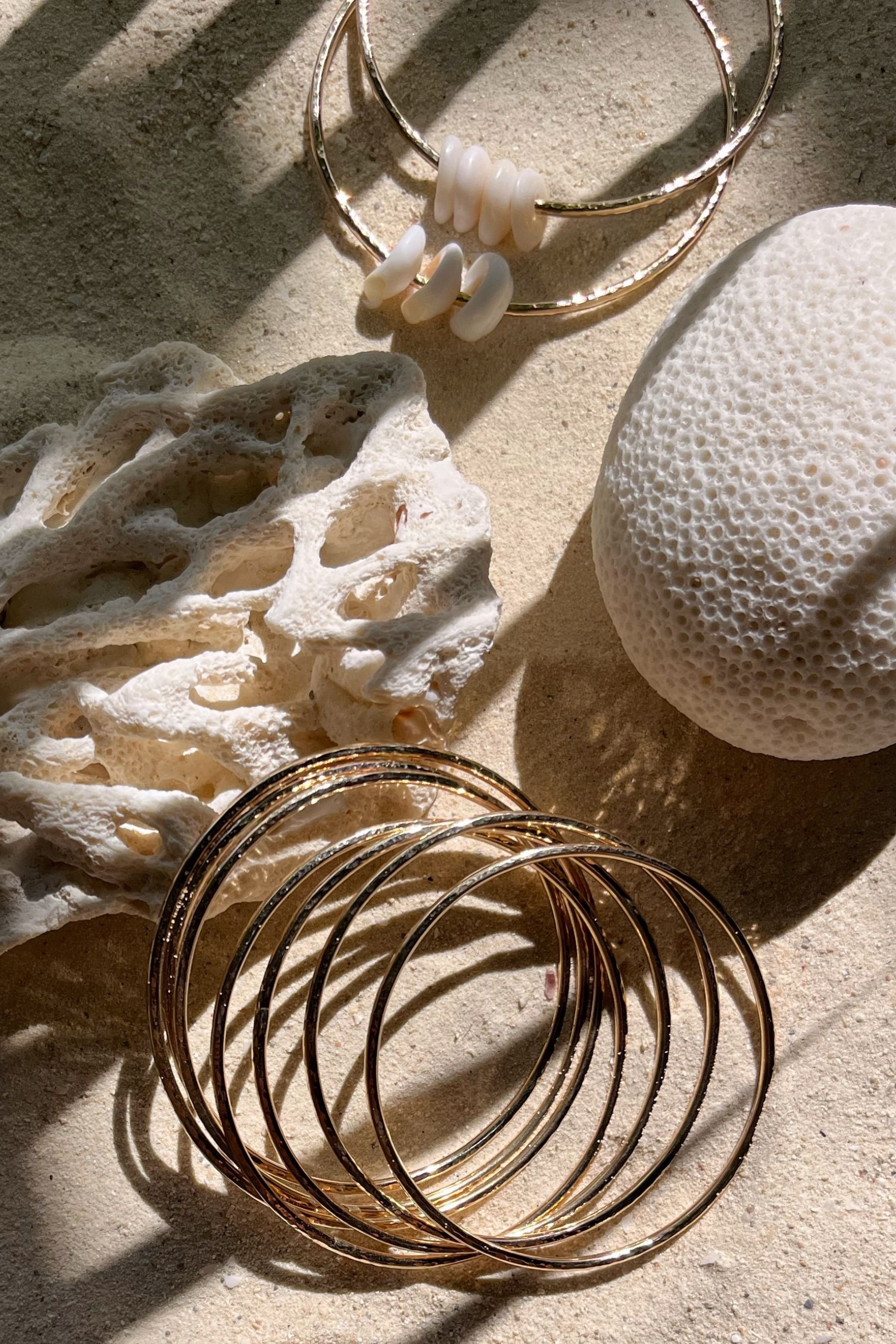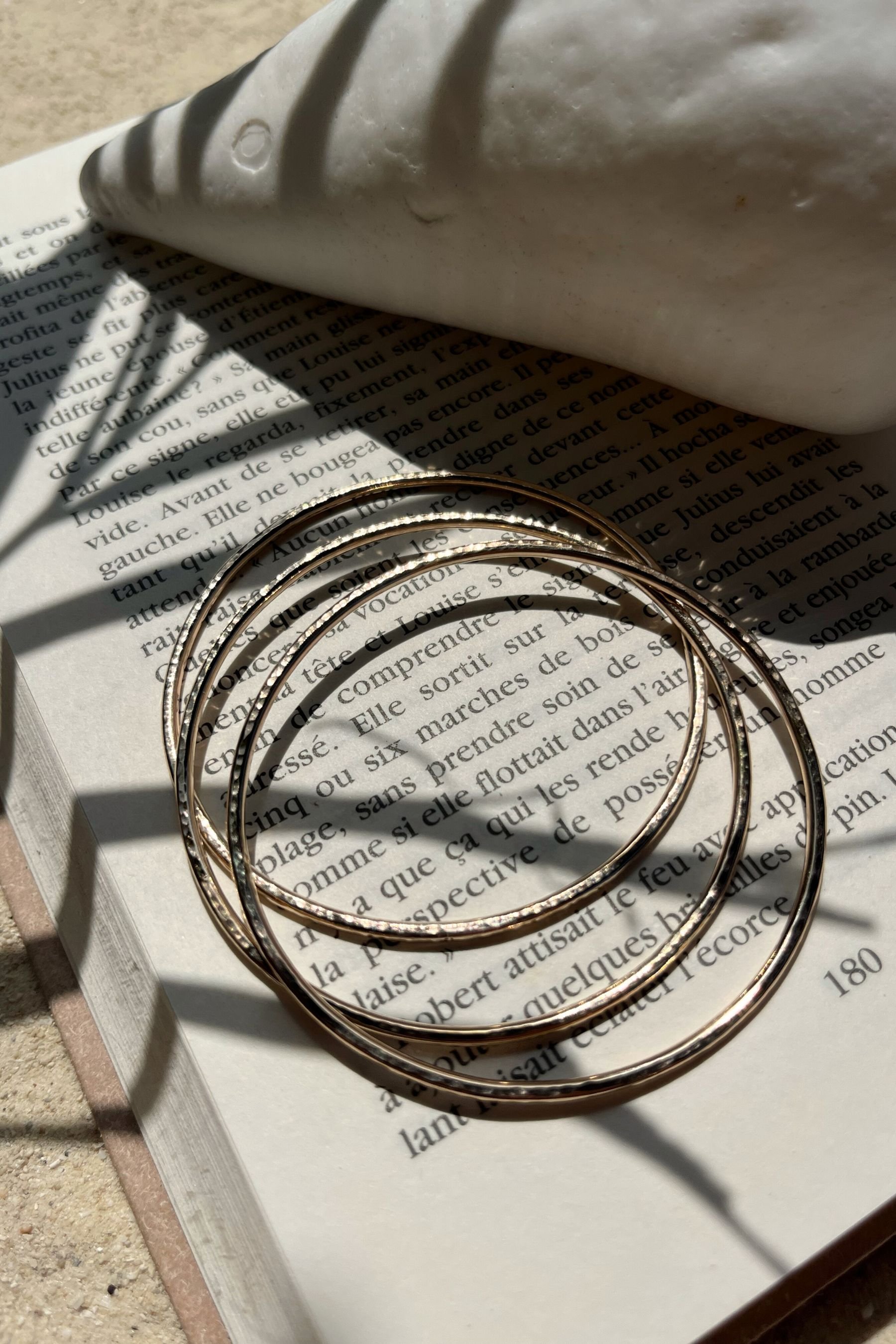 Joncs en goldfilled 14K ou argent massif, les bracelets ont une finition martelée qui capte joliment la lumière.